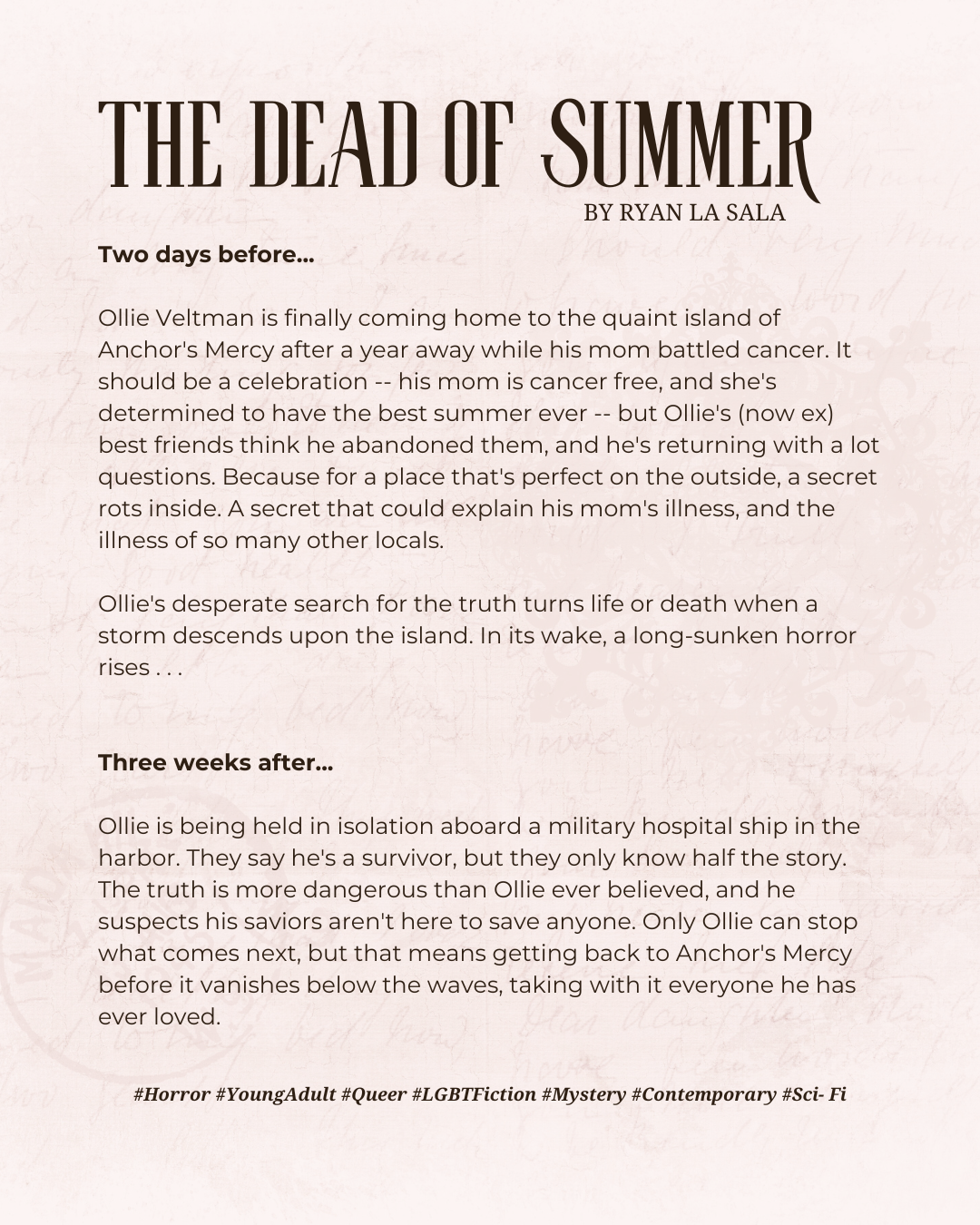 Join us Wednesday October 8th at 6pm to discuss our thoughts on The Dead of Summer by Ryan La Sala our likes/dislikes, and star rating!